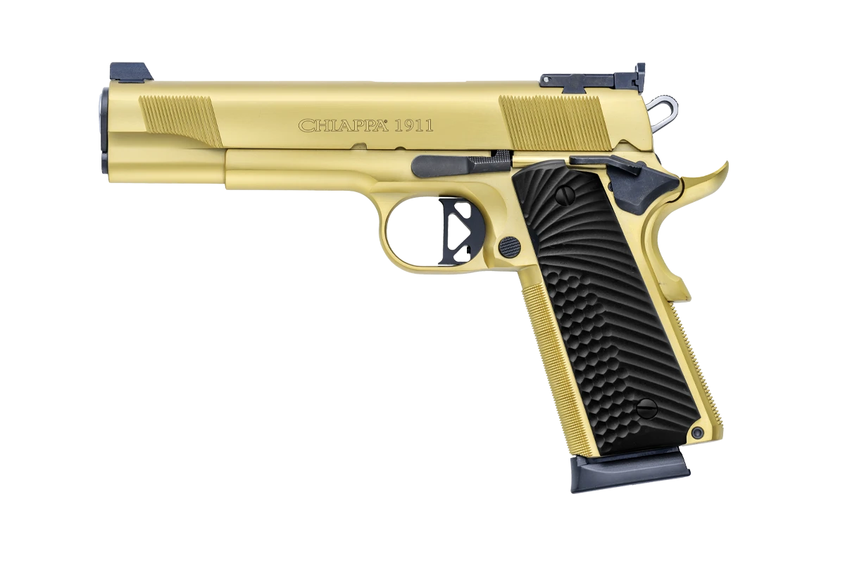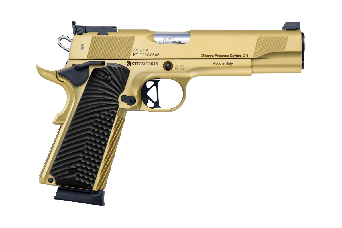 Chiappa CF 1911 Empire Grade je kakovostna jeklena 1911 pištola v kalibru .45 ACP z 5″ (127 mm) cevjo, zlato PVD obdelavo in robustnimi črno G10 ročaji z grobim teksturiranjem; Single-Action sprožilni sistem, ročna varovalka in natančni target zadnji merek (nastavljiv za windage in elevation) zagotavljajo klasično natančnost in zanesljivo delovanje, medtem ko kapaciteta 8+1 in masa približno 2,57 lb (≈ 1,17 kg) prispevata k stabilnemu rokovanju.