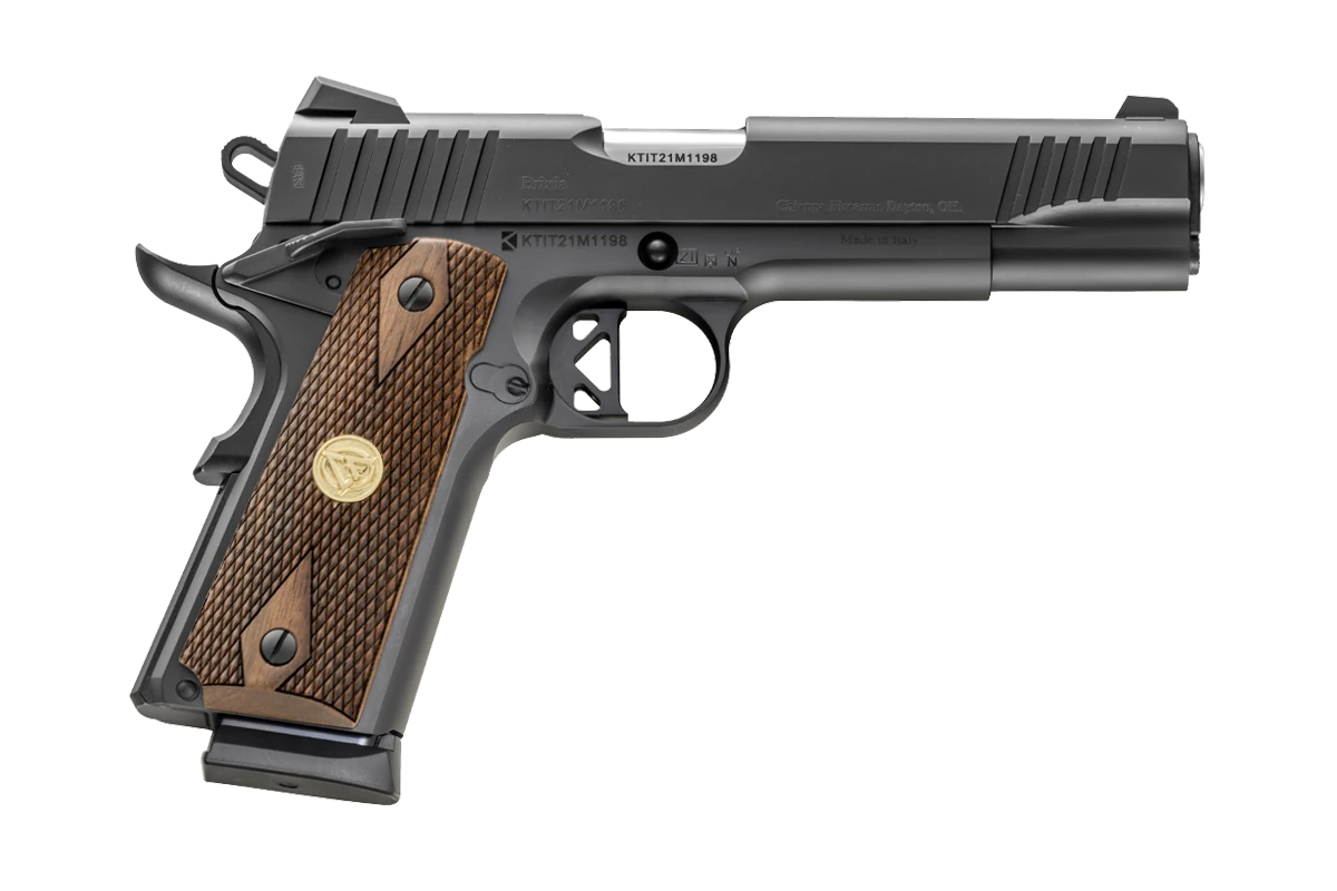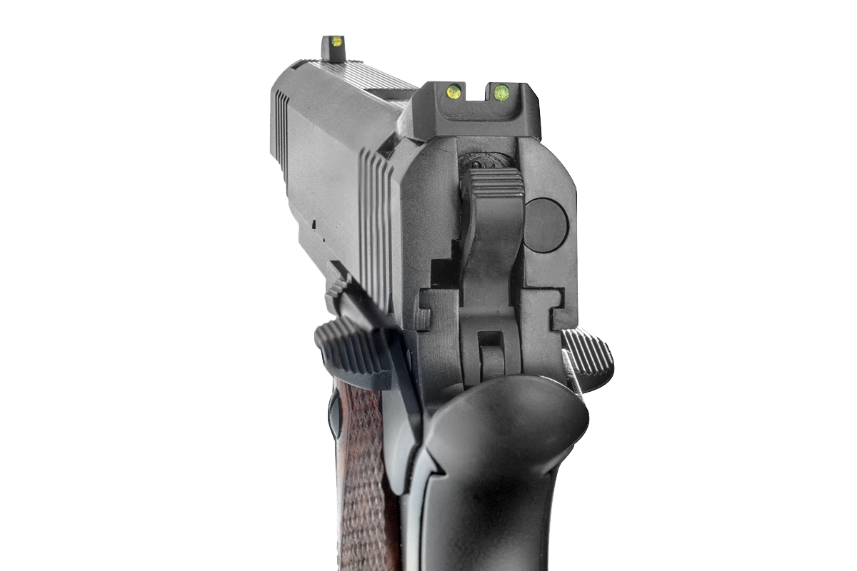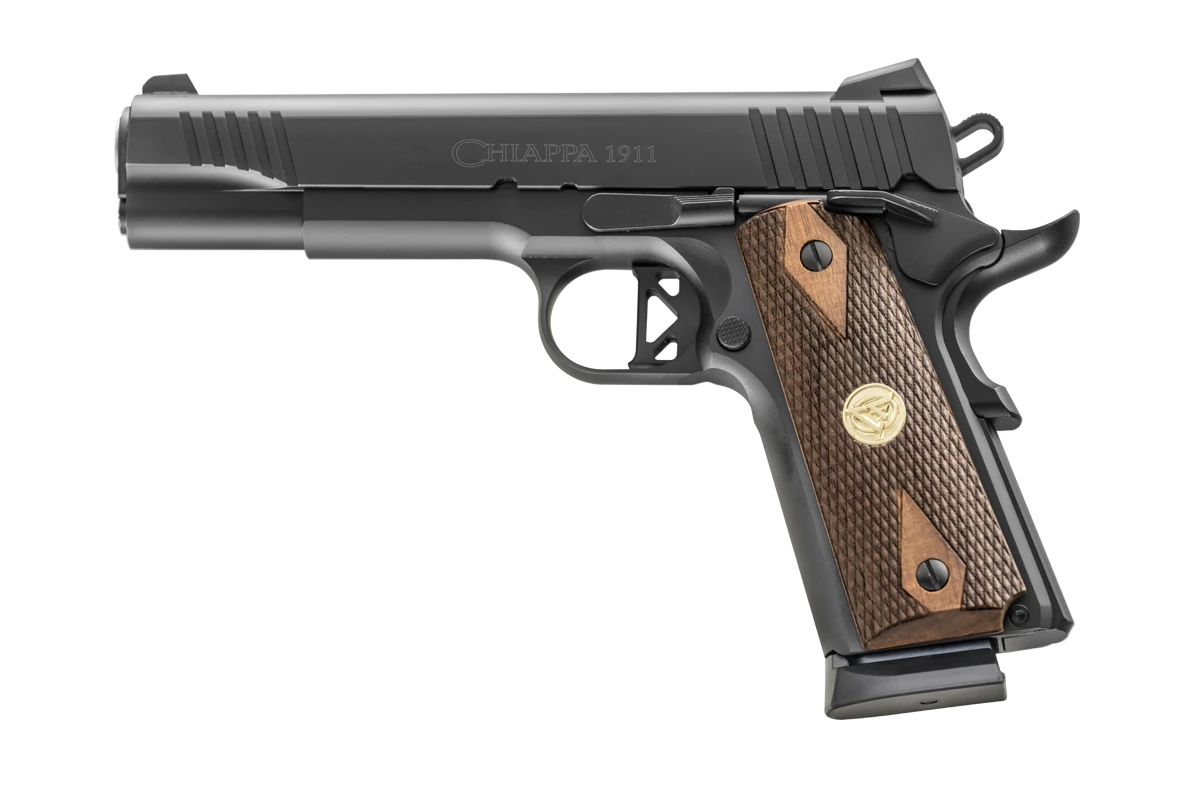 Chiappa CF 1911 Superior Grade je trdna jeklena 1911 pištola v kalibru 9 mm Luger z 5″ (127 mm) cevjo, oblikovana za strelce, ki iščejo zanesljivo in klasično izkušnjo s sodobnimi izboljšavami. Opremljena je z orehovimi ročaji z diamantno teksturo, rdečim fiber-optic zadnjim merkom nastavljivim za windage ter standardno Single-Action mehaniko; ročna in notranja varovalka ter kapaciteta 8+1 zagotavljata preverjeno delovanje in enostavno uporabo, medtem ko črna površinska obdelava in jeklena konstrukcija prispevata k vzdržljivosti in stabilnosti pri streljanju.