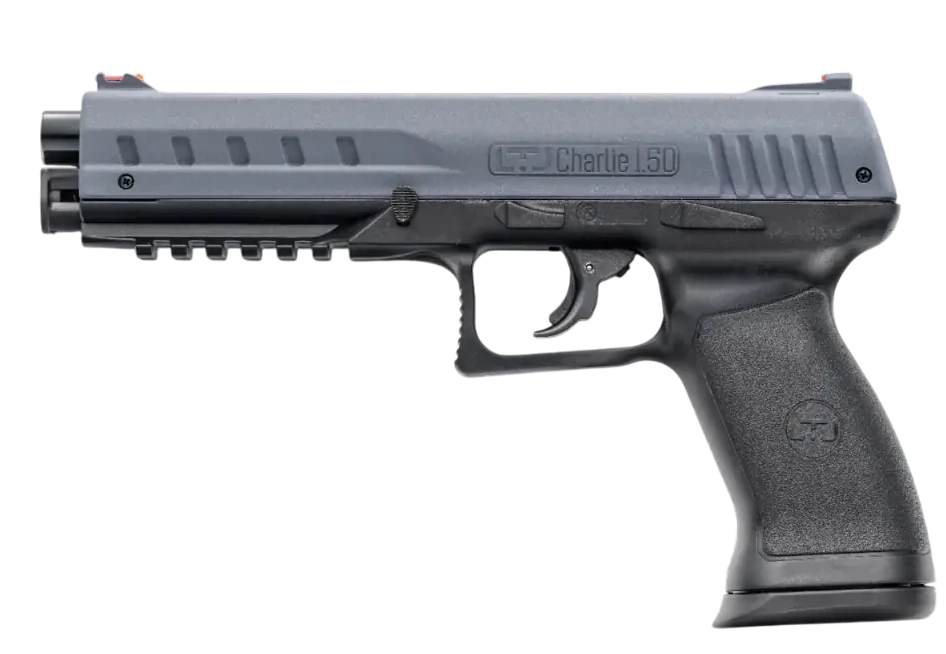LTL Charlie 1.50 je polavtomatska CO₂ pištola kalibra .50, namenjena treningu in nesmrtonosni samoobrambi. Zasnova združuje kovinsko zaklepno ohišje in cev s trpežnim polimernim okvirjem, pri čemer indikator polnjenja ter fiksna fluorescenčna merka omogočata hitro in varno rokovanje. Pištola uporablja snemljiv 5-strelni magazin, nameščen pod cevjo, kar omogoča hitro ponovno polnjenje. Na voljo je v različicah z izhodno energijo do 18 J.